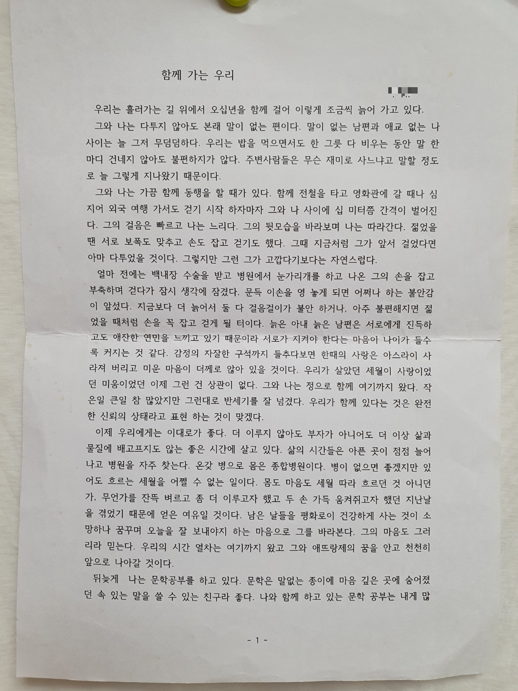 2년 전, 엄마를 요양원에 모신 후 집정리를 하던 언니가 사진을 찍어 보내왔다. 아마도 아빠가 돌아가시기 전에 쓰신 글인 듯했다. 돋보기안경을 쓰고 구부린 자세로 자판 하나하나를 천천히 두들기며 써 내려갔을 엄마의 모습을 상상하니 마음이 먹먹해진다.