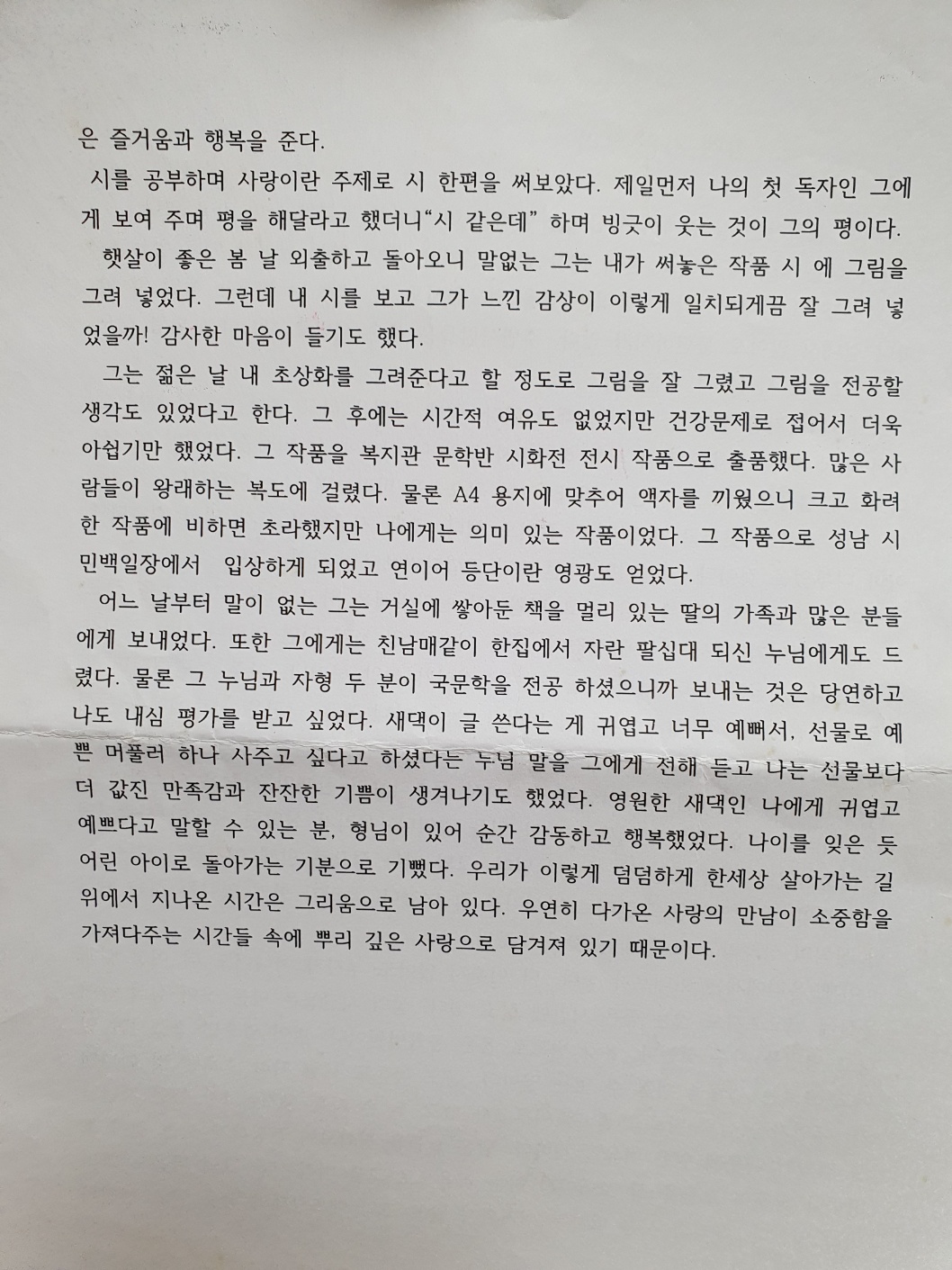 그는 젊은 날 내 초상화를 그려준다고 할 정도로 그림을 잘 그렸고 그림을 전공할 생각도 있었다고 한다. 그 후에는 시간적 여유도 없었지만 건강문제로 접어서 더욱 아쉽기만 했었다. 그 작품을 복지관 문학반 시화전 전시 작품으로 출품했다. 많은 사람들이 왕래하는 복도에 걸렸다. 물론 A4 용지에 맞추어 액자를 끼웠으니 크고 화려한 작품에 비하면 초라했지만 나에게는 의미 있는 작품이었다. 그 작품으로 성남 시민백일장에서 입상하게 되었고 연이어 등단이란 영광도 얻었다.