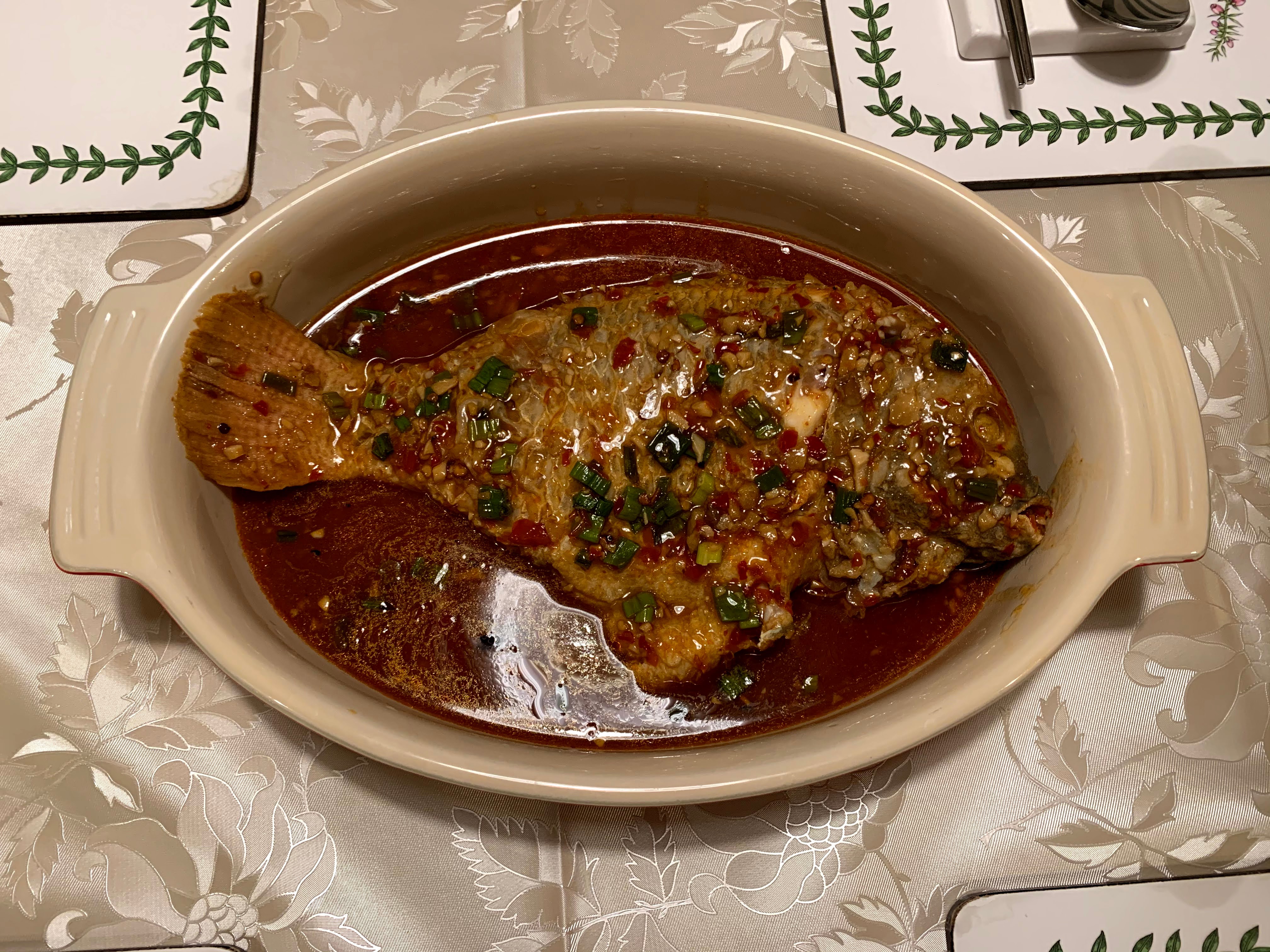 우리 가족이 가장 좋아하는 스촨 중국 음식점에서 테이크아웃한 요리로 결혼기념일 저녁 식사를 하였다. 메뉴는 각자 좋아하는 것 한 가지씩 고르기로 하였다. 이번에 내가 주문한 요리는 스촨 칠리 빈 소스로 조리된 틸라피아. 처음 주문해 본 것인데 우리 입맛에는 잘 맞았다. 비싸고 양이 적어서 좀 그렇지만.