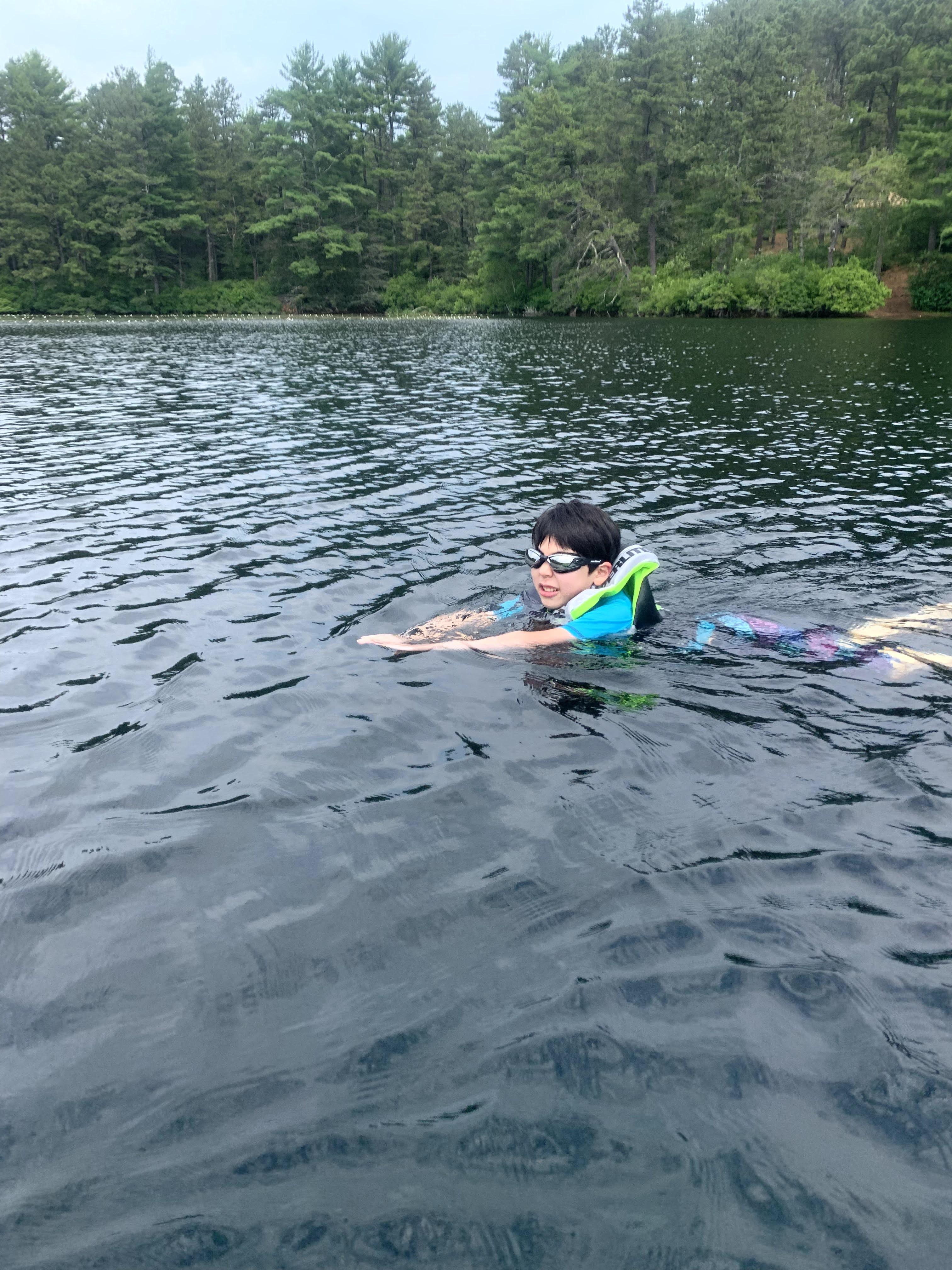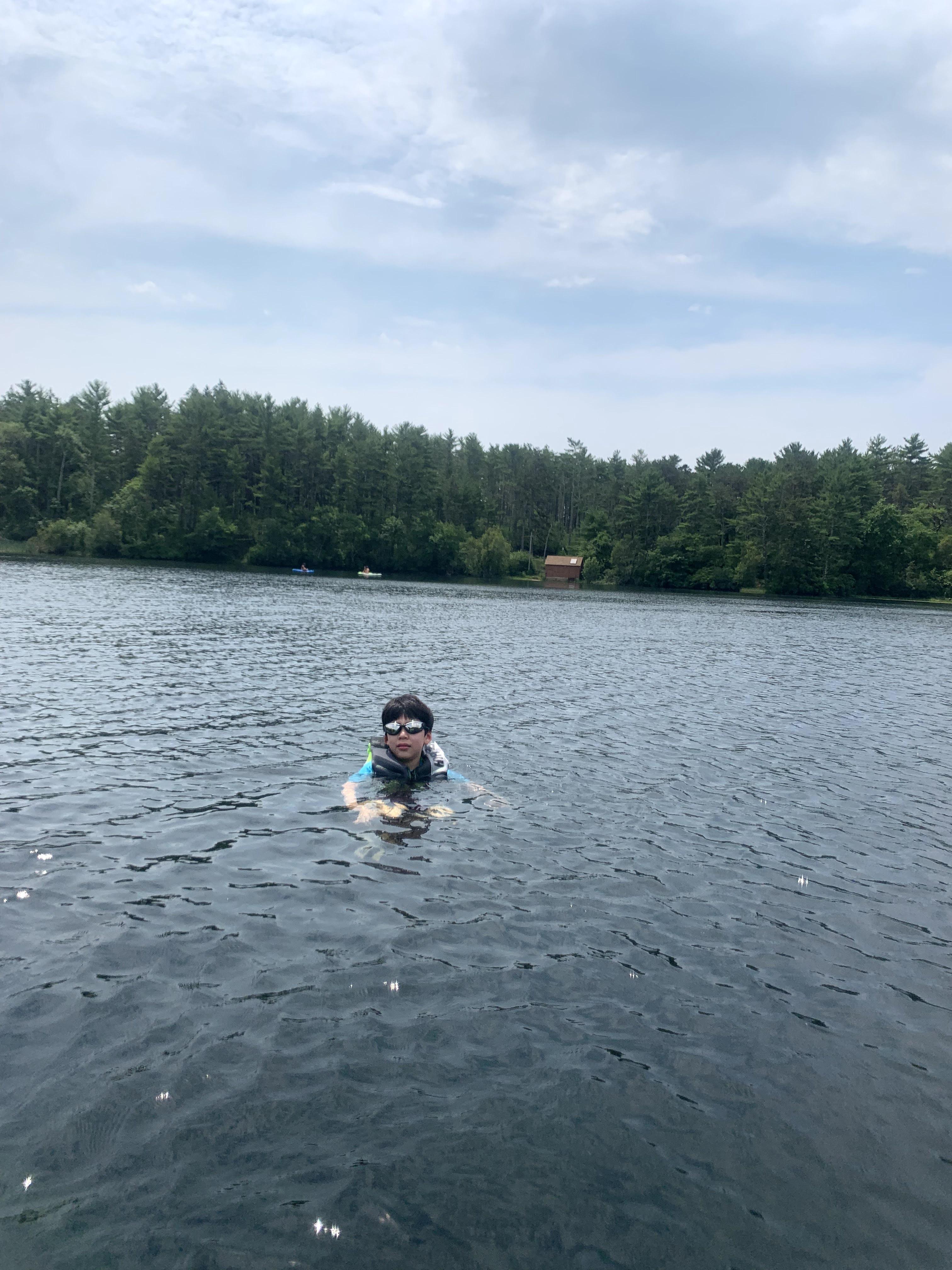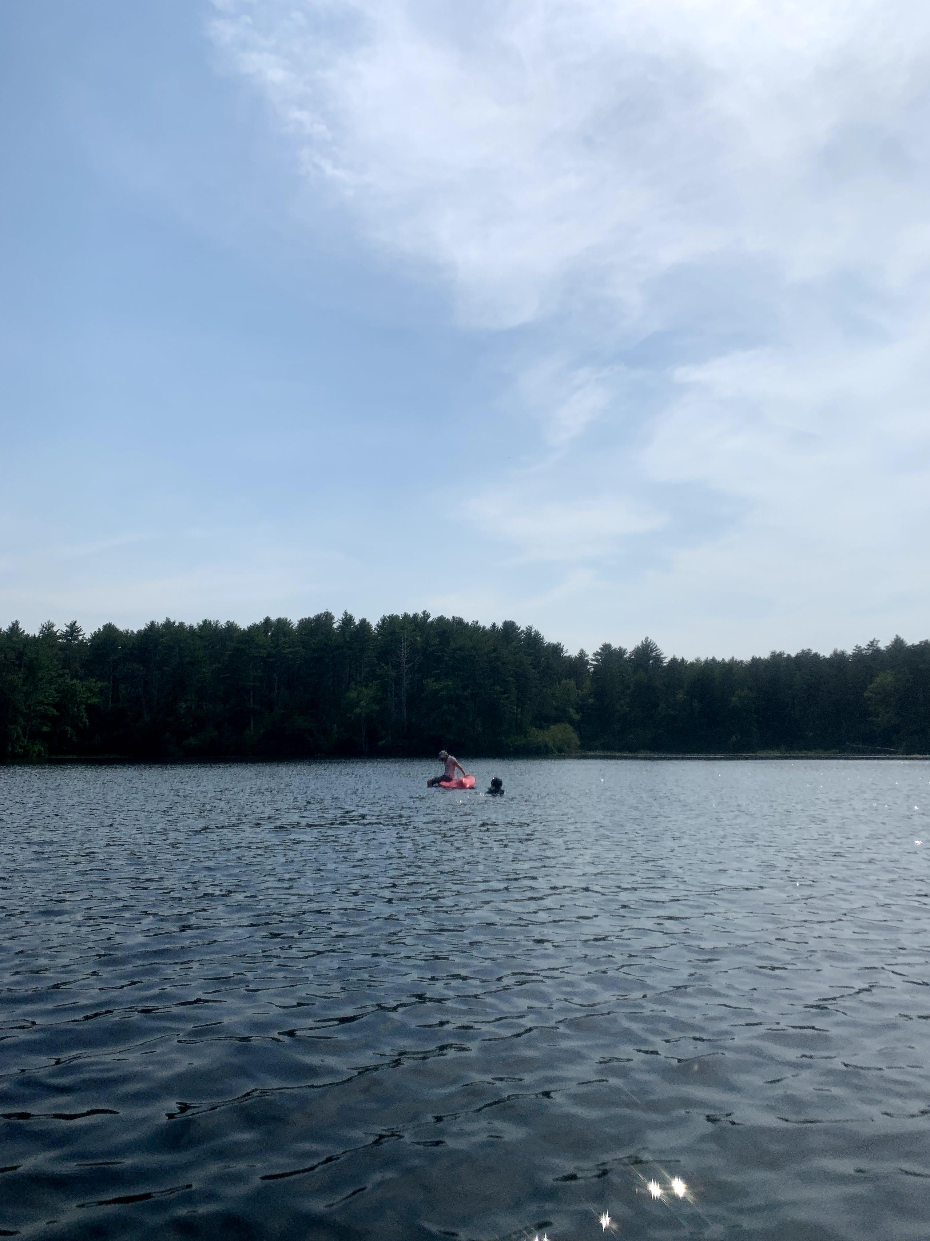 아들아이는 라이프 재킷을 입고 호수 이쪽 끝에서 저쪽 끝까지 가로질러 수영을 했다. 그리고 나는 카약을 타고 아이를 뒤따라 다녔다. 이번에 처음으로 횡단을 하는 것이라 중간에 가다 쉬고 가다 쉬기를 반복하였지만 어쨌든 해내었다. 호수 한가운데서 둥둥 떠다니는 느낌이 그렇게 좋은가보다.