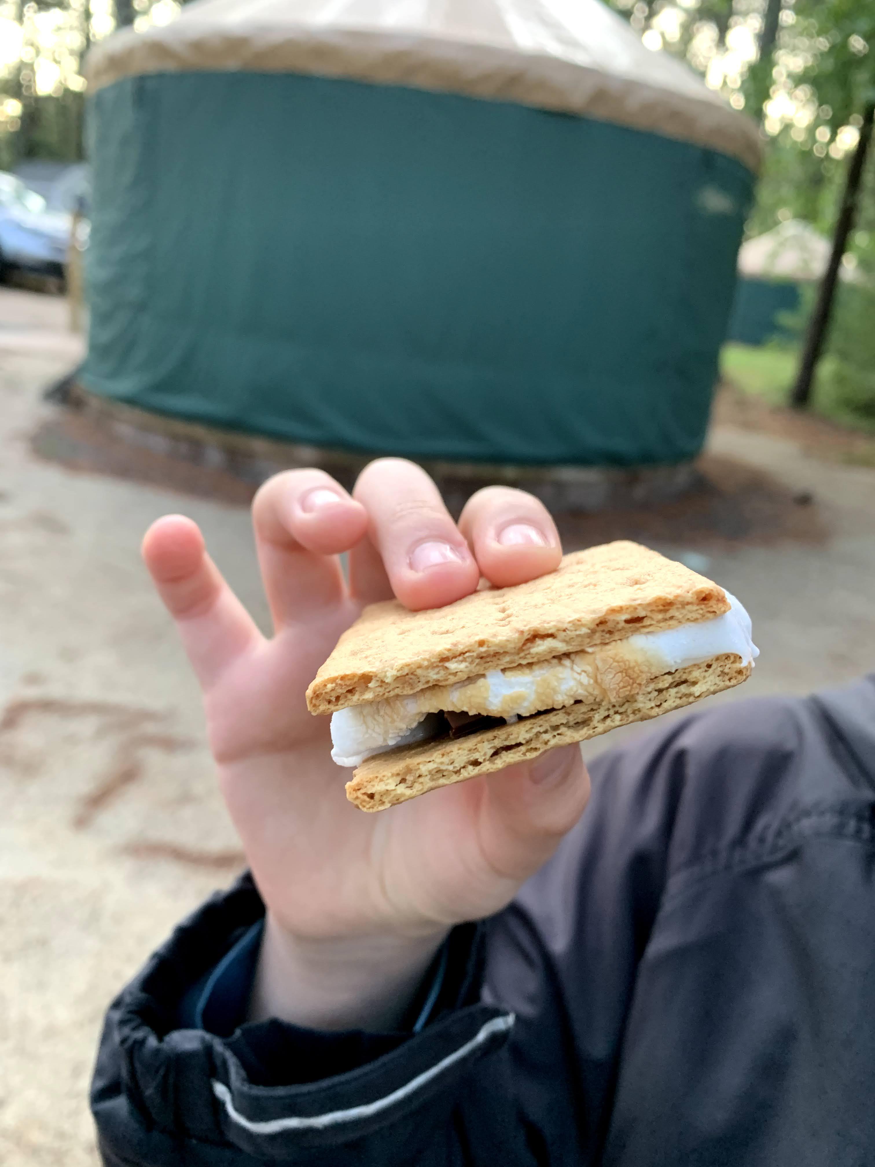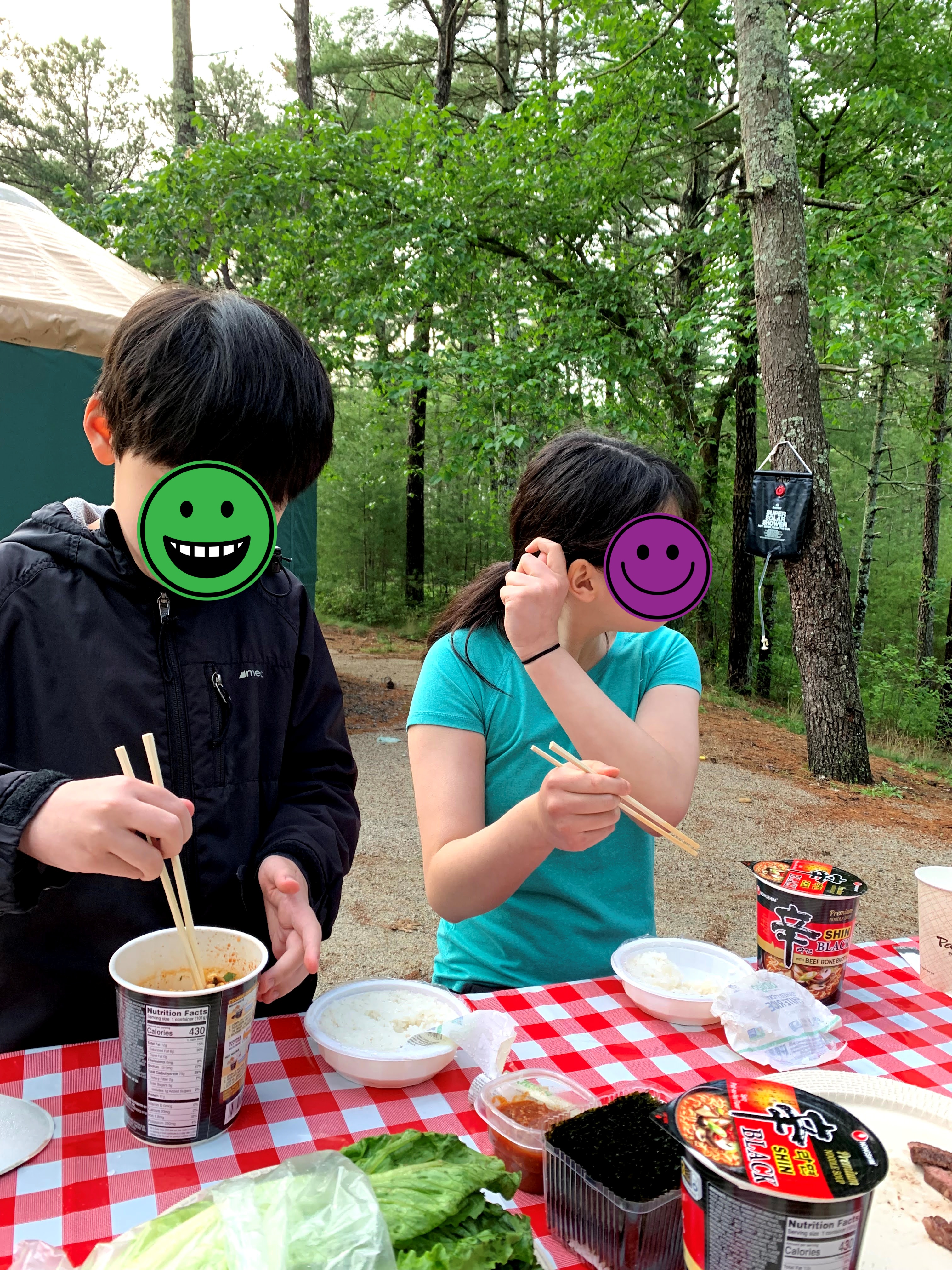 굳이 고생하러 왜 캠핑을 하는지 모르겠다는 남편이 그나마 좋아하는 것은 야외에서의 바베큐이다. 숯불로 잘 구워낸 소고기를 야채 쌈에 싸 먹고, 여기에 얼큰한 라면, 그리고 캠프 파이어에서 빠질 수 없는 S'more까지! 참고로 S'more는 모닥불에 알맞게 그을린 마시멜로우와 초콜릿을 샌드위치처럼 크래커 사이에 끼워 넣어 먹는 국민 간식이다. 내용물에서 알 수 있듯이 지극히 미국스러운 간식이 되겠다.