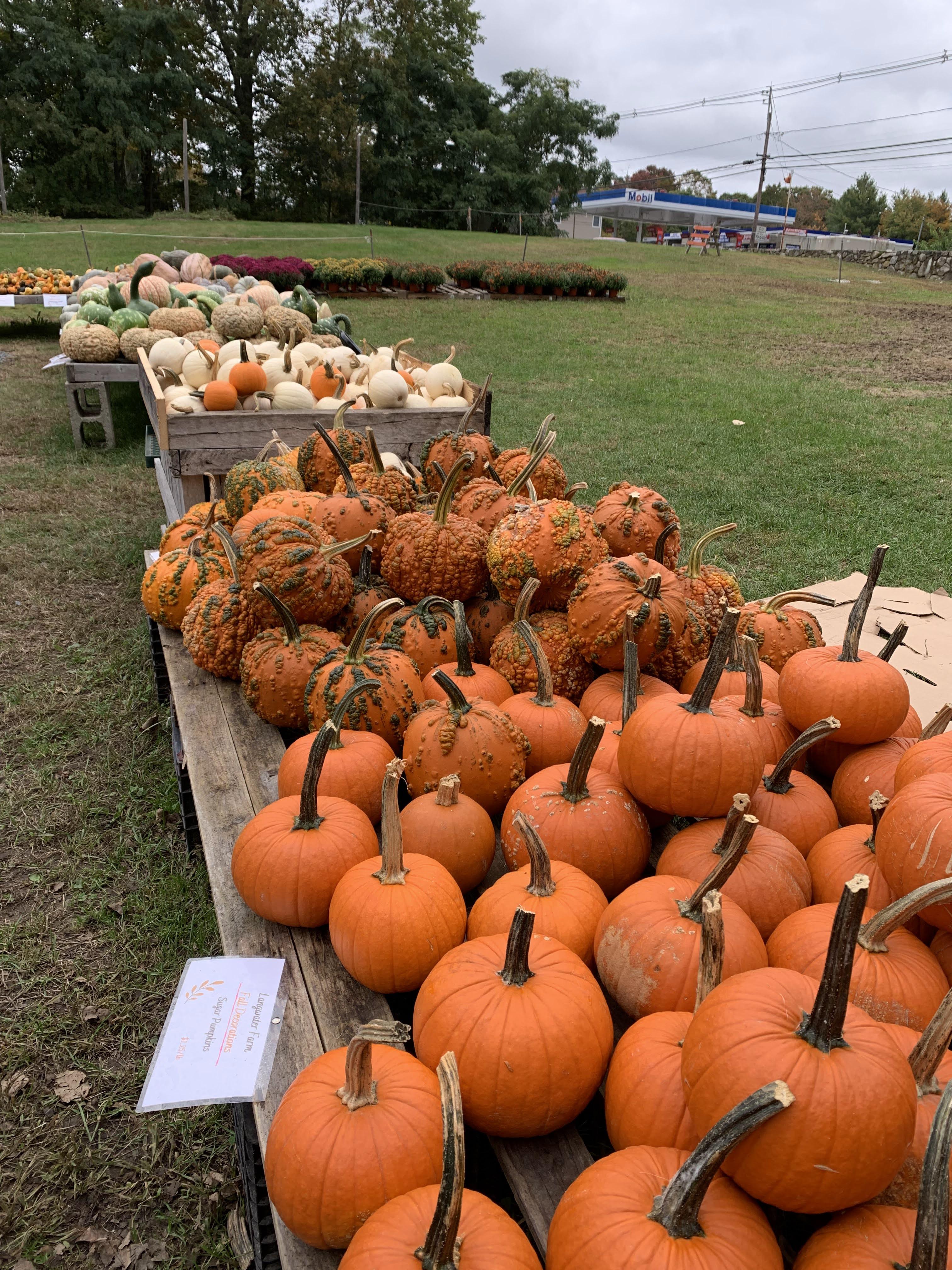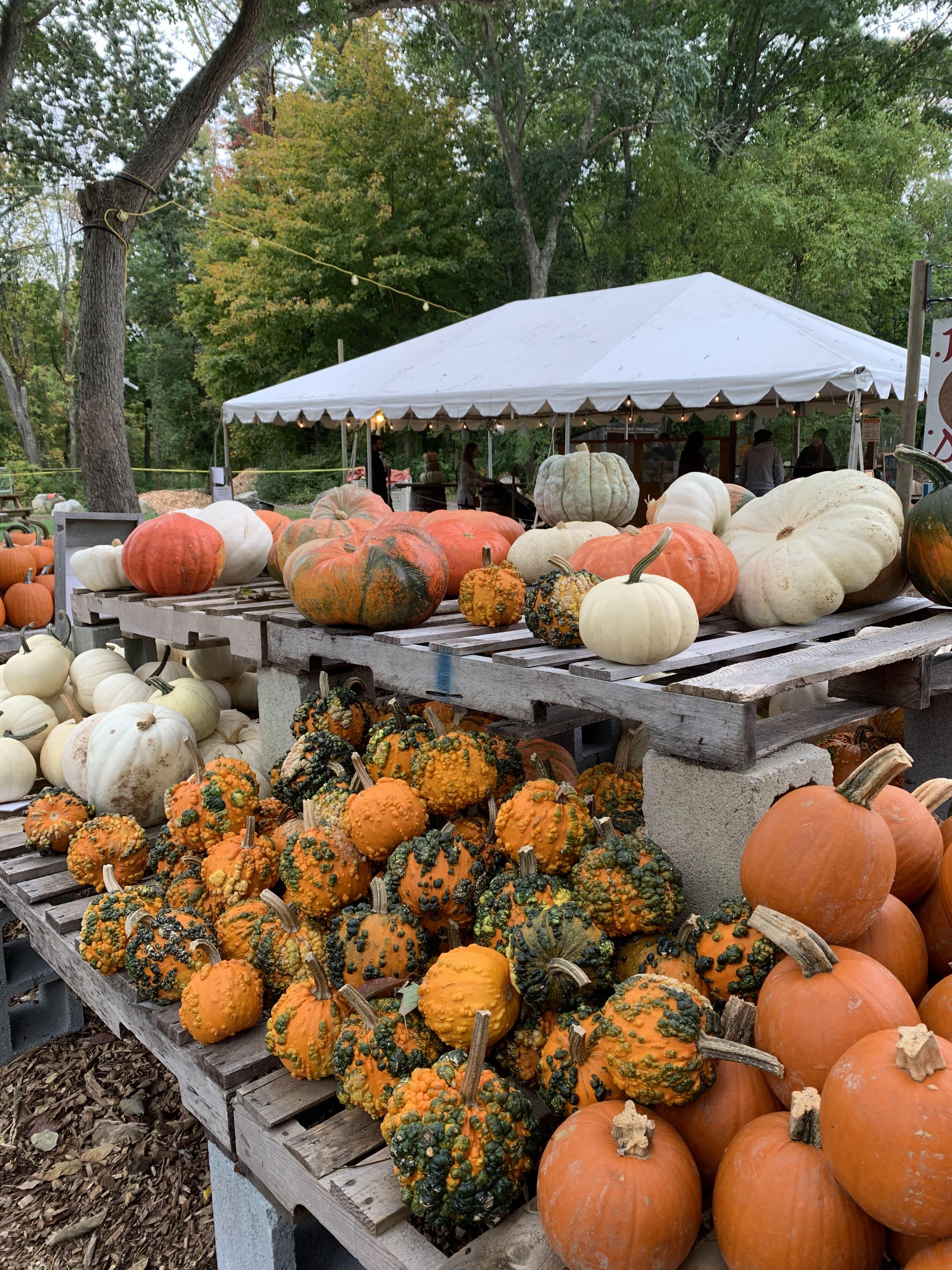 농장 마당에 다양한 모양의 호박들을 팔고 있다.