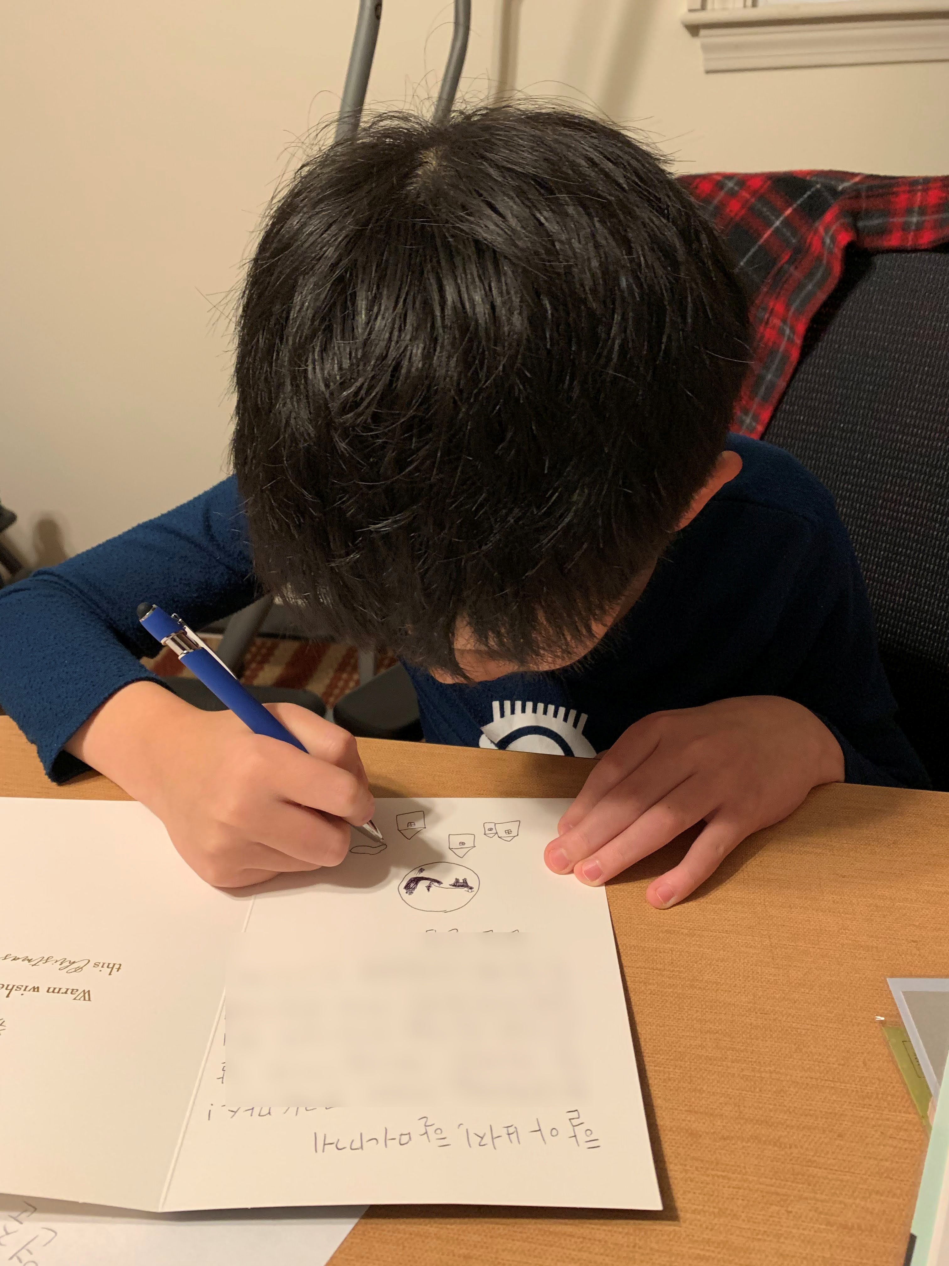 땡스기빙 연휴 동안 아이들은 한국의 가족에게 보낼 크리스마스 카드를 썼다.
