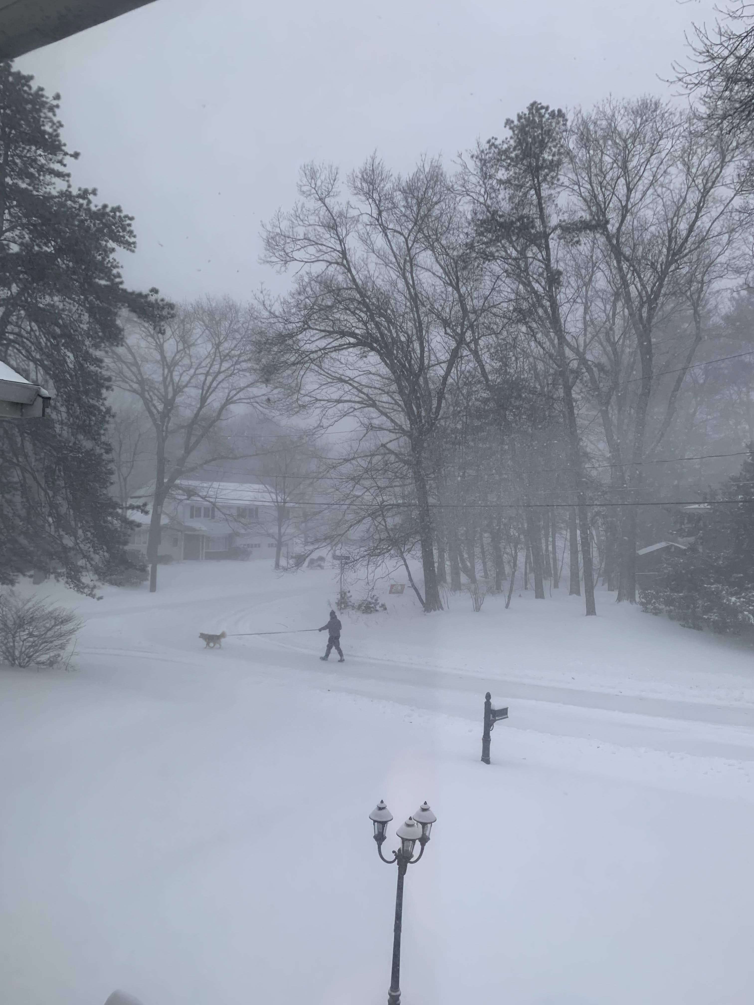 눈이 내리는 와중에도 강아지 산책시키는