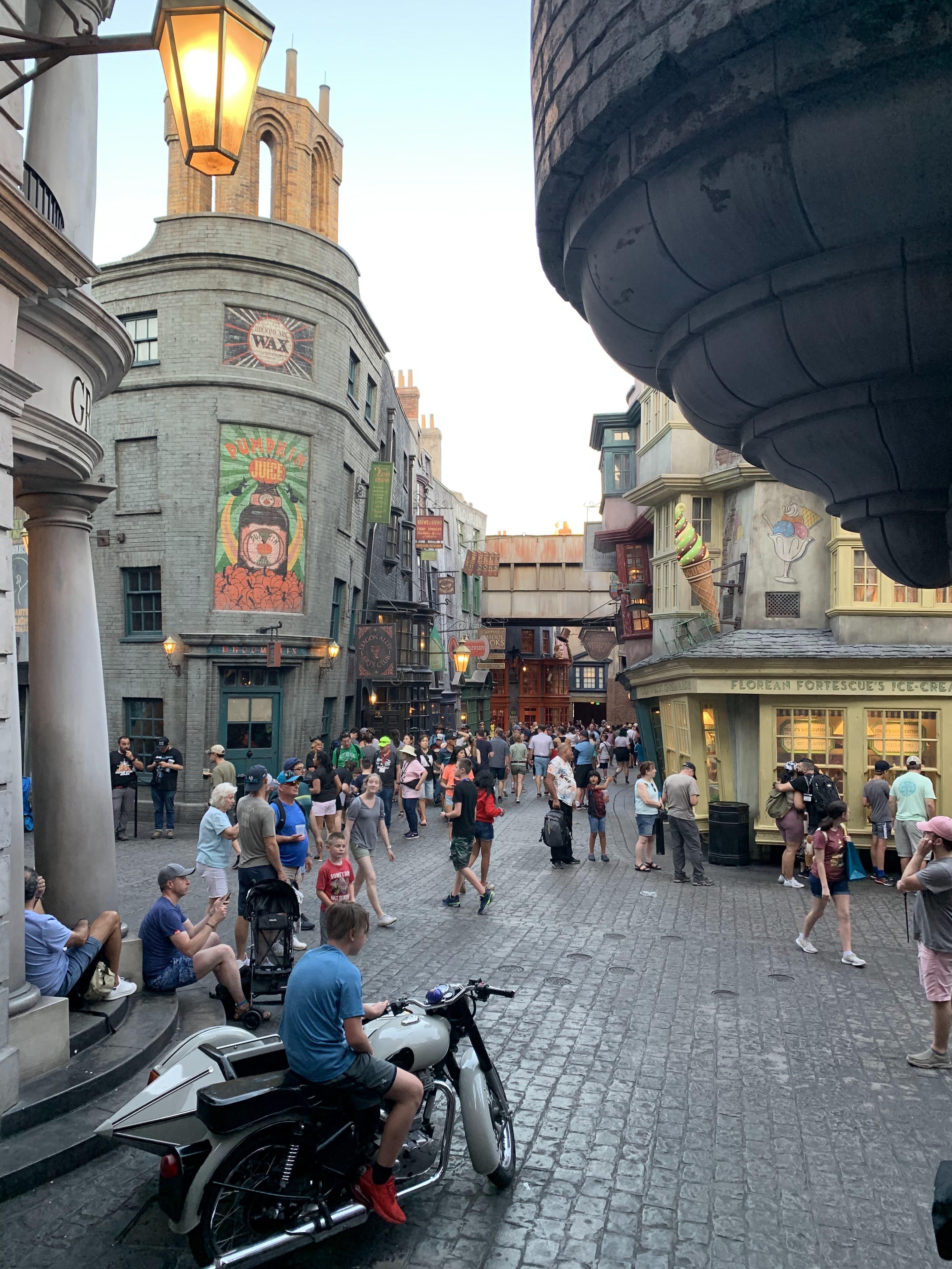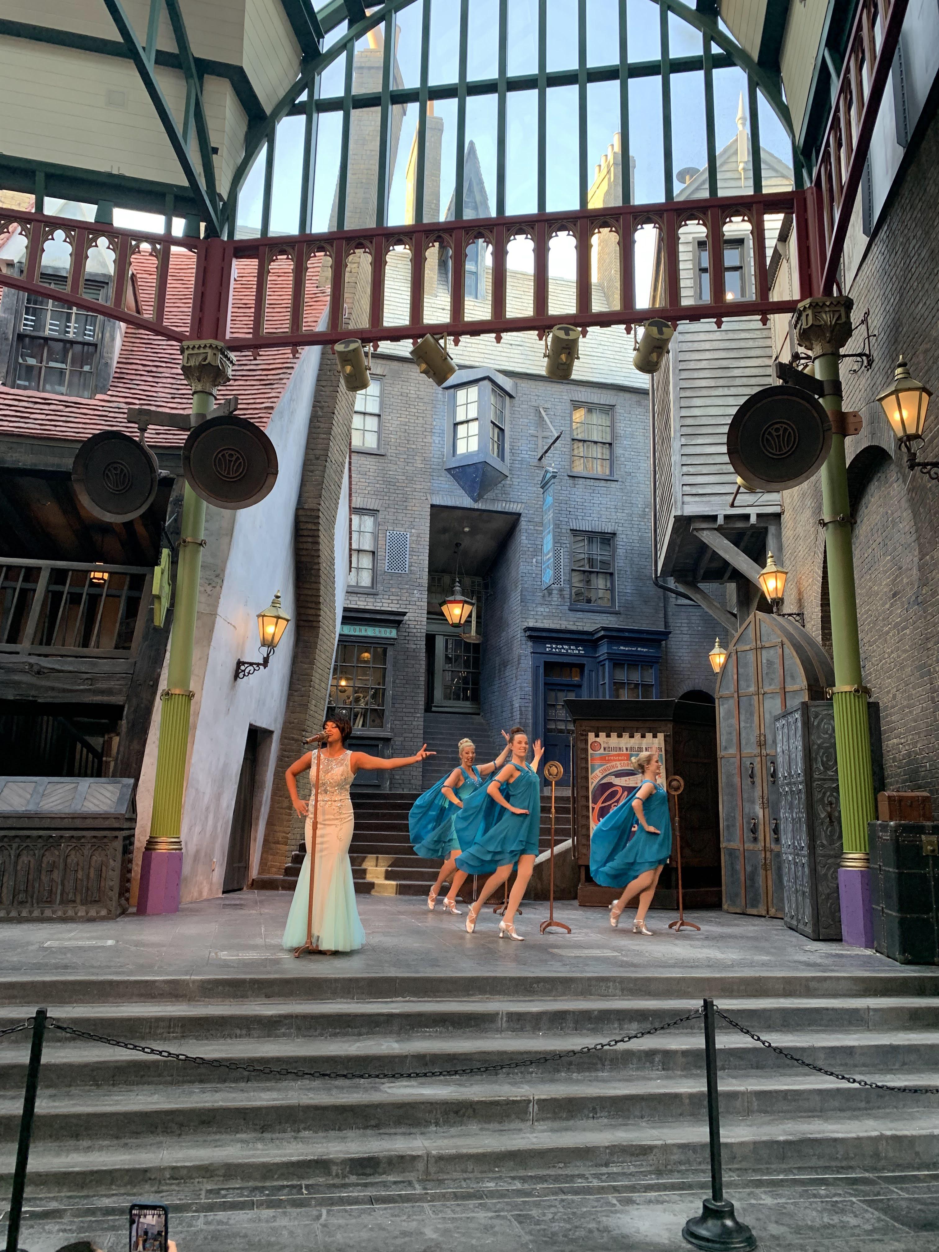 저녁 6시가 넘어서 유니버설 스튜디오 플로리다에 입장하였다. 그리고 곧장 해리포터의 다이애건 앨리 구역을 향해 갔다. 과연 영화 속 다이애건 앨리 일부를 그대로 재현해 놓았는데 우리 아이들은 신이 안 날 수가 없었다. 그곳에서는 마침 노래와 춤 공연을 시작하길래 자리에 앉아 구경하였다. 모든 걸 다 떠나서 흥이 넘치는 거리의 풍경을 접하는 게 얼마만인가 싶어 감격스러웠다.