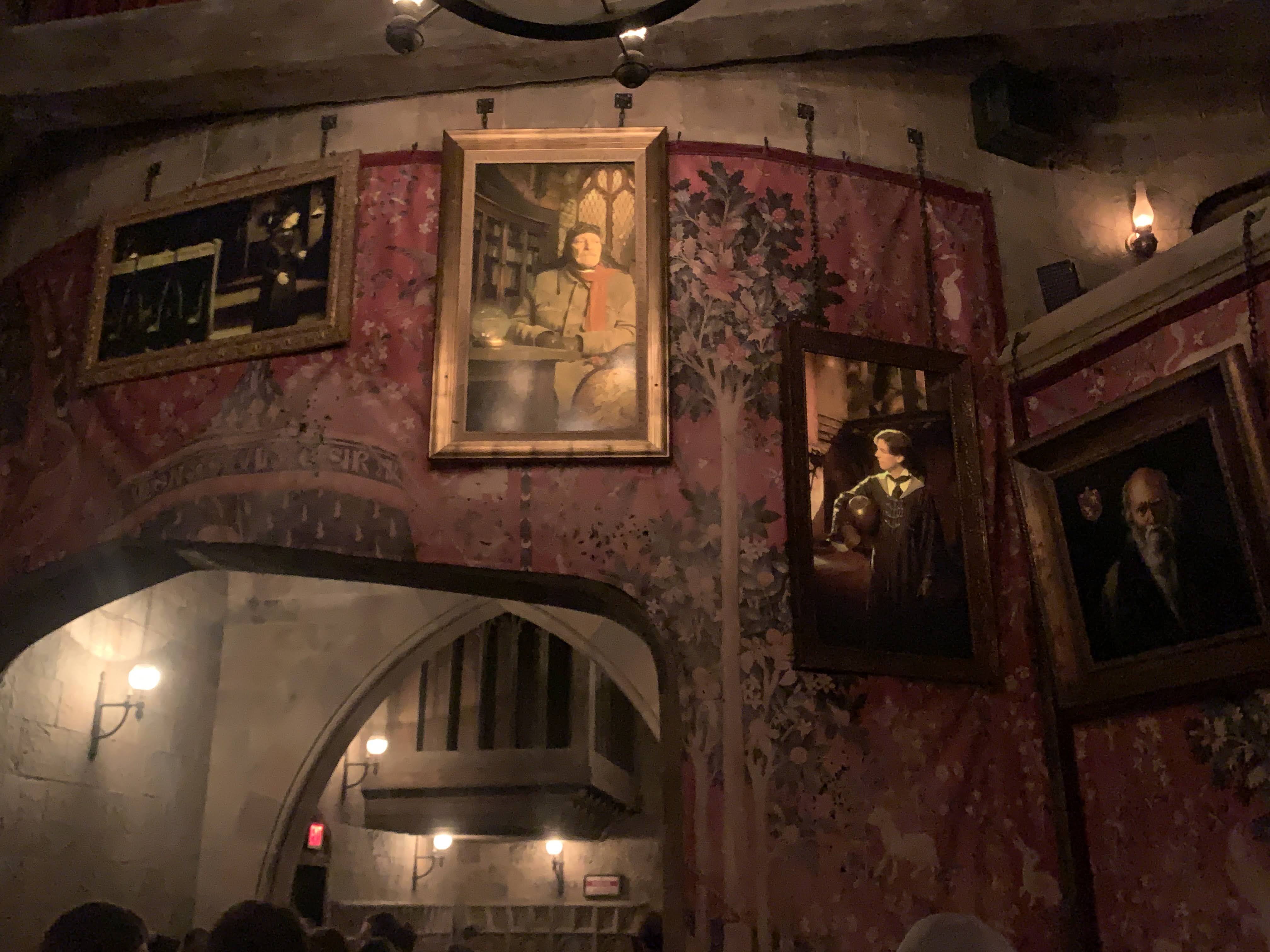 라이드와 관련하여서 아무런 사전 조사가 없었고 일단 해리포터와 관련된 것은 다 타보자는 생각에 먼저 도착하여 줄을 선 곳이 Harry Potter and the Forbidden Journey라는 3D 다크라이드였다. 사람들이 워낙 많았기 때문에 한참을 줄 서서 들어갔는데, 건물 안의 대기 장소가 영화 속 마법 학교의 일부를 그대로 재현해 놓아서 각종 소품들, 그리고 움직이는 그림들을 보는 재미가 상당했다.