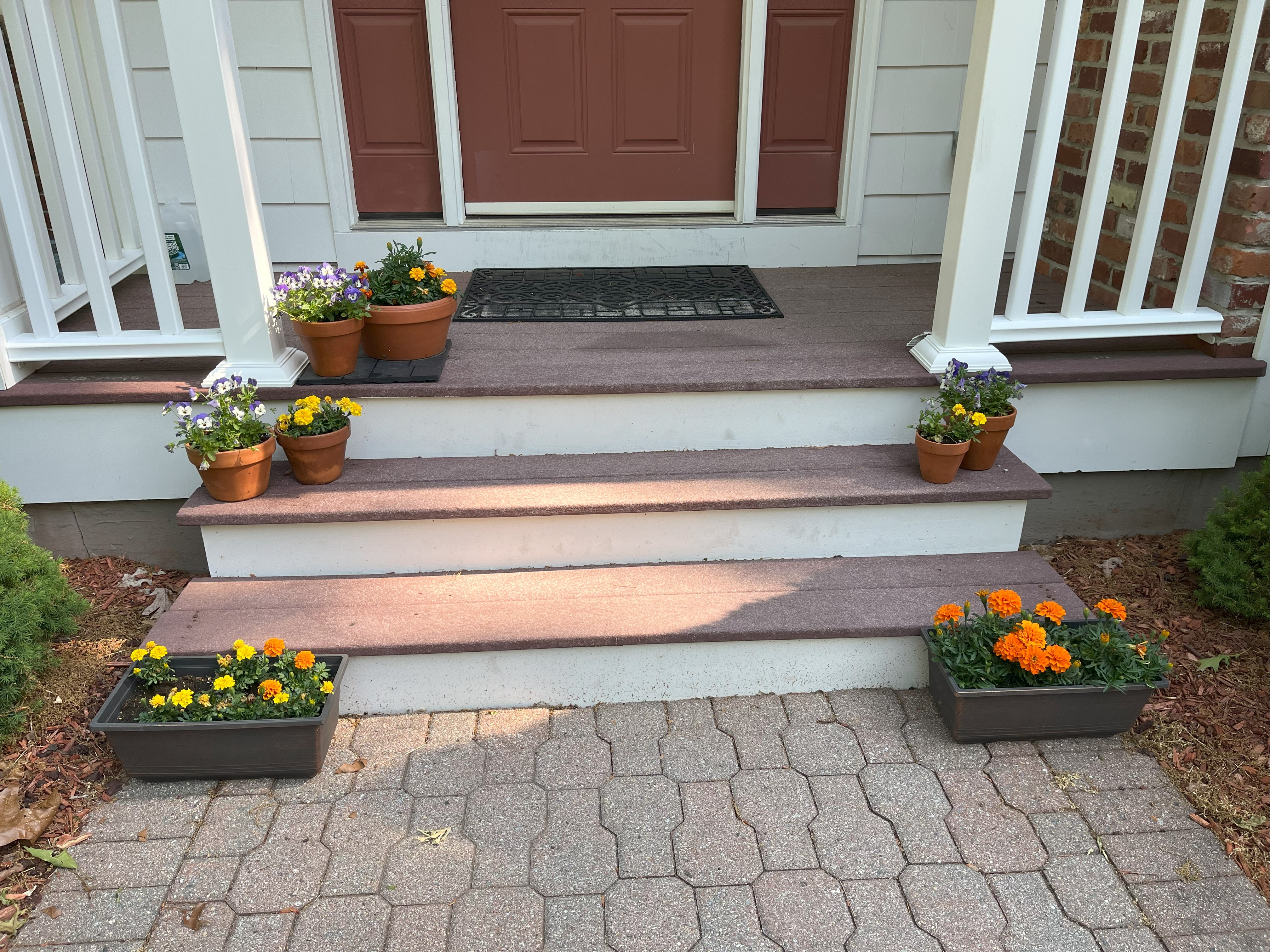 요렇게 현관 앞 계단에 꽃 화분을 장식해 봤다. 여름 내내 끊임없이 꽃을 피우는 메리골드 위주로.